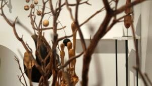 L’artiste Caroline Polle travaille sur de grandes structures aériennes en glycine, clématite, houblon, ronce, saule, noisetier et papier, donnant forme à des suspensions évoquant des cerfs-volants. Suite à une rencontre avec l’artiste Claire Tingaud, elle découvre qu’au Guatemala, en Nouvelle-Zélande, en Inde, les cerfs-volants représentent les liens entre les morts et les vivants. Ils sont associés à des rituels de clôture de deuil. Dans la création de ses structures aériennes, Caroline Polle tend à rendre visible cette dimension de deuil. Dans un monde brutal, destructeur, injuste, souvent inhumain et pesant, il lui importe de créer des formes inspirant la légèreté.
